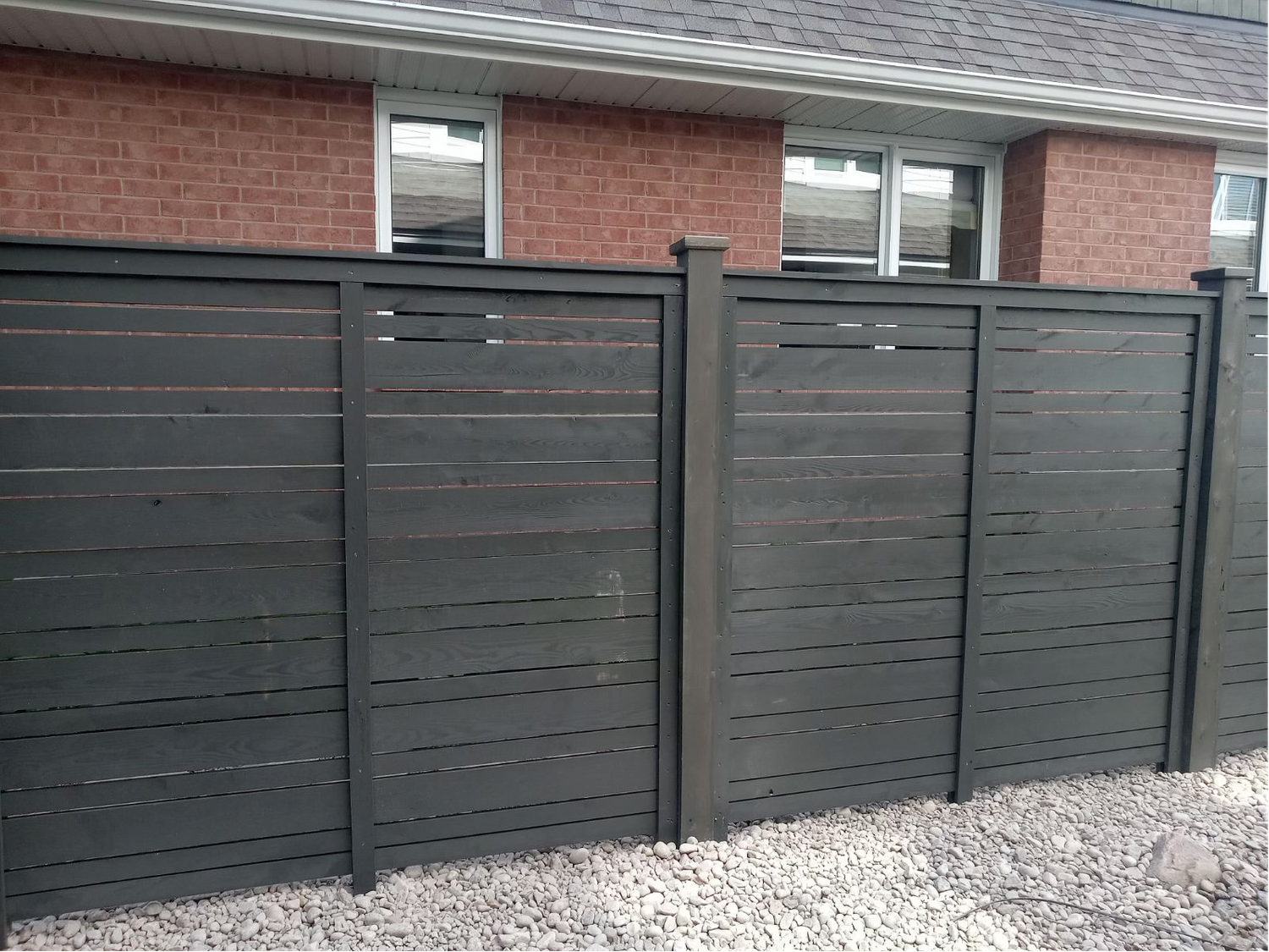 This style of fencing features short vertical boards separated by horizontal stringers. These pre-assembled panels make it easy to install while the hemlock grey coating will provide a maintenance free fence for many years.
